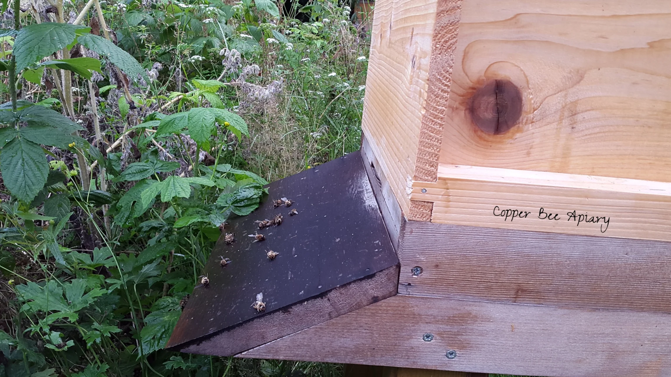 Others looked for where their home used to be, and landed on the neighbouring hives. Pond Hive and Copper Hive became covered in homeless bees seeking entry: