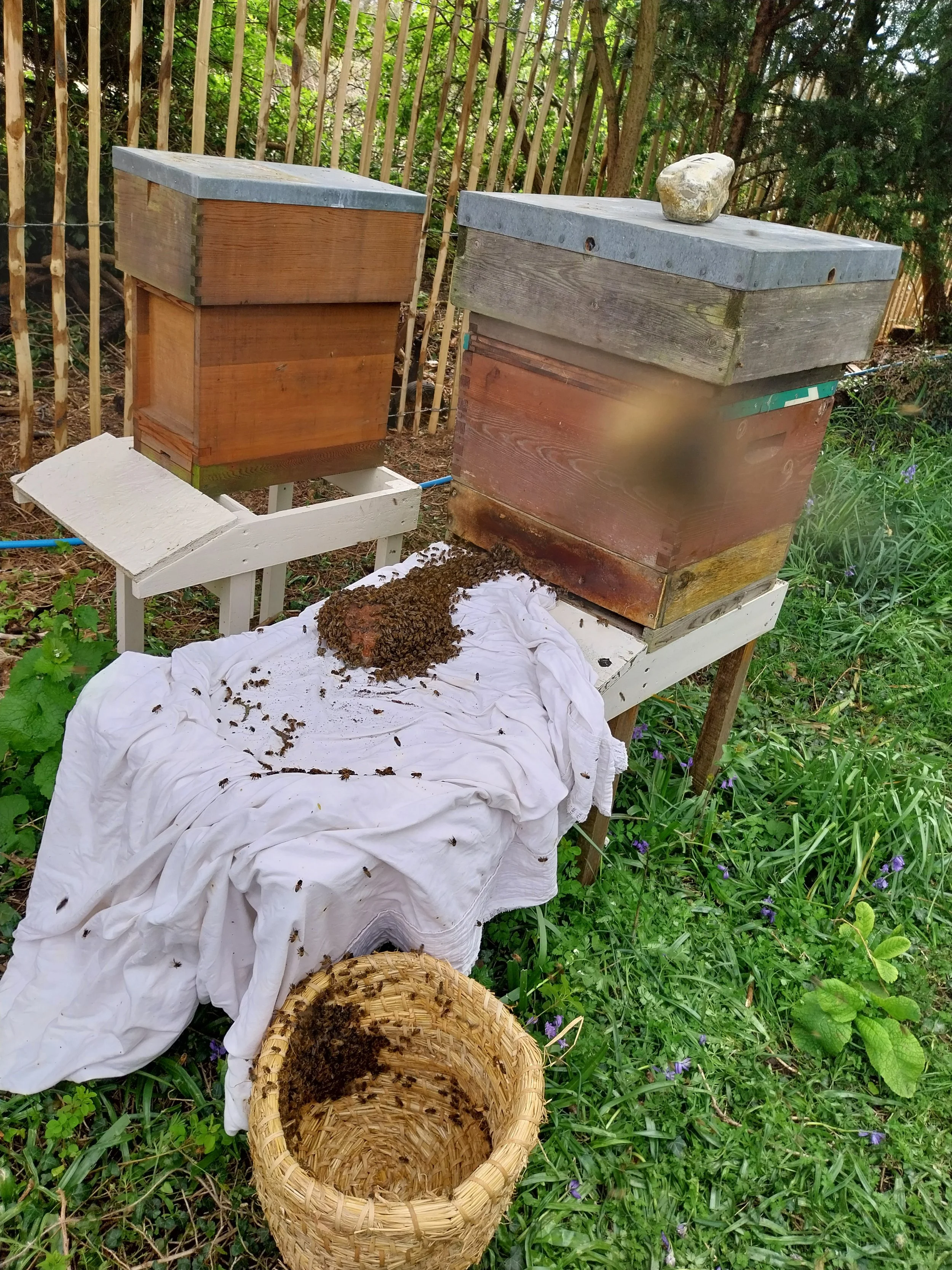 I’m supposed to be at work. Ideally I’d leave them a bit longer to more fully regroup…although not long enough to up sticks and swarm off to wherever they have in mind for a new home. But with most bees now in the skep, we go ahead with hiving them.