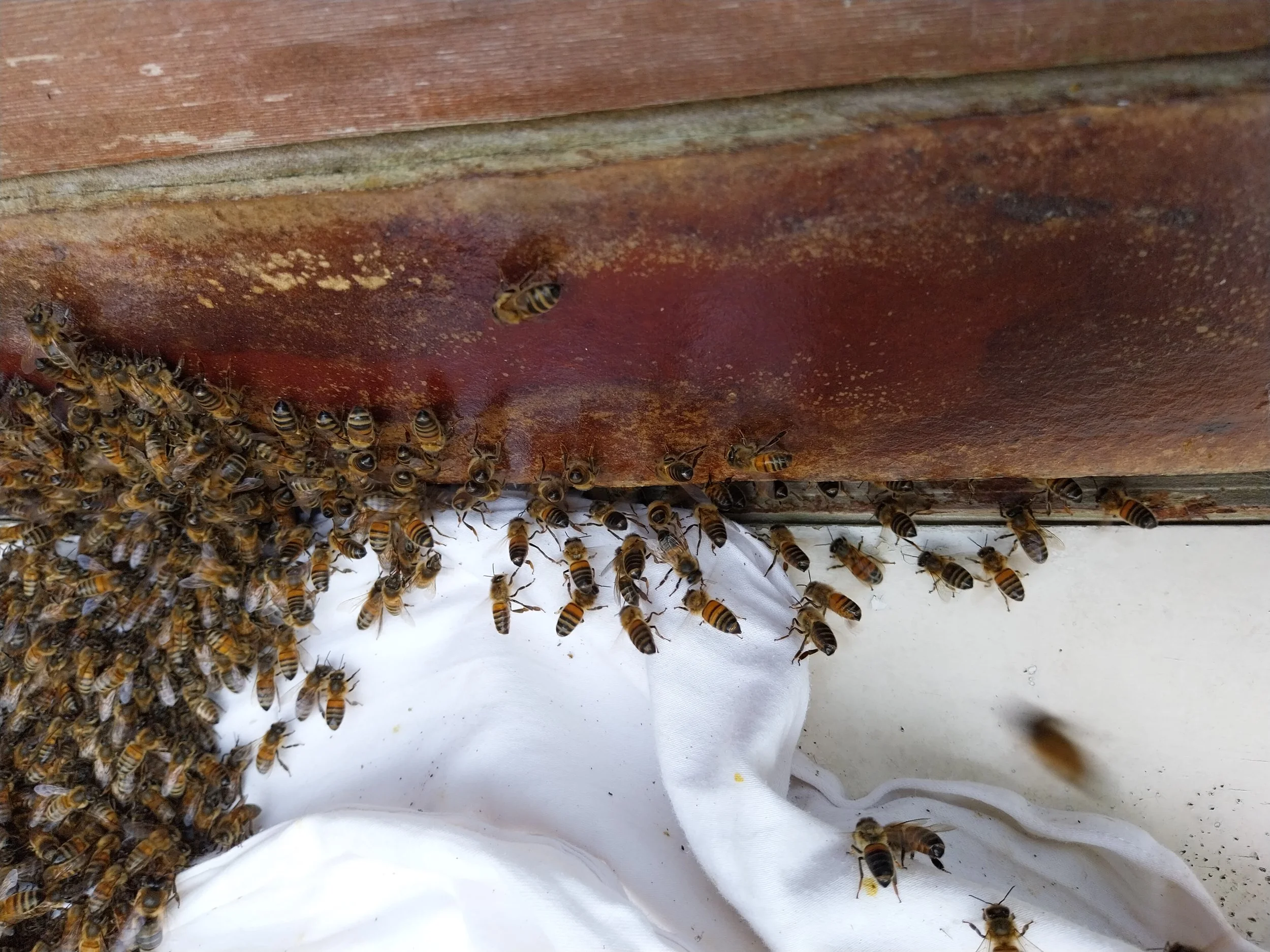 And wait for the magic to start. I always find it incredible that this works. For the first few minutes, there is just a heap of confused bees on a sheet, climbing on the rock that I inadvertently left in their way (and there’s no chance of picking it up now!). But then it starts to happen…the bees begin to walk in to the hive.
