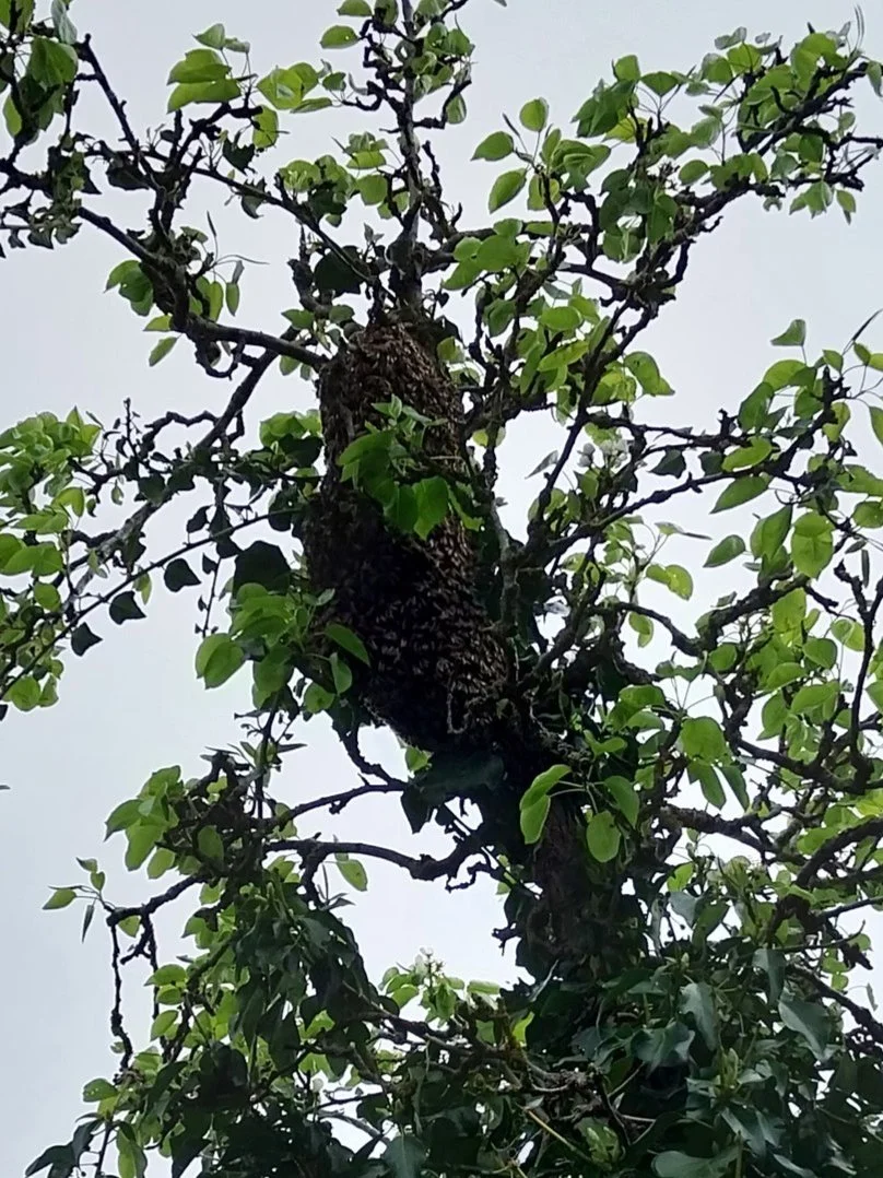 I can’t see Queen Elizabeth, but I check through twice looking for her in case I’m still in time. I split the remaining colony into three. There are so many bees in the box that I’m hoping they have not yet swarmed, perhaps delayed by the previous day’s lashing rain. But no. I could’ve saved myself the time of searching through that box, by going straight to the pear tree which is a favourite for swarms in my apiary. Because there they are. Right at the top.